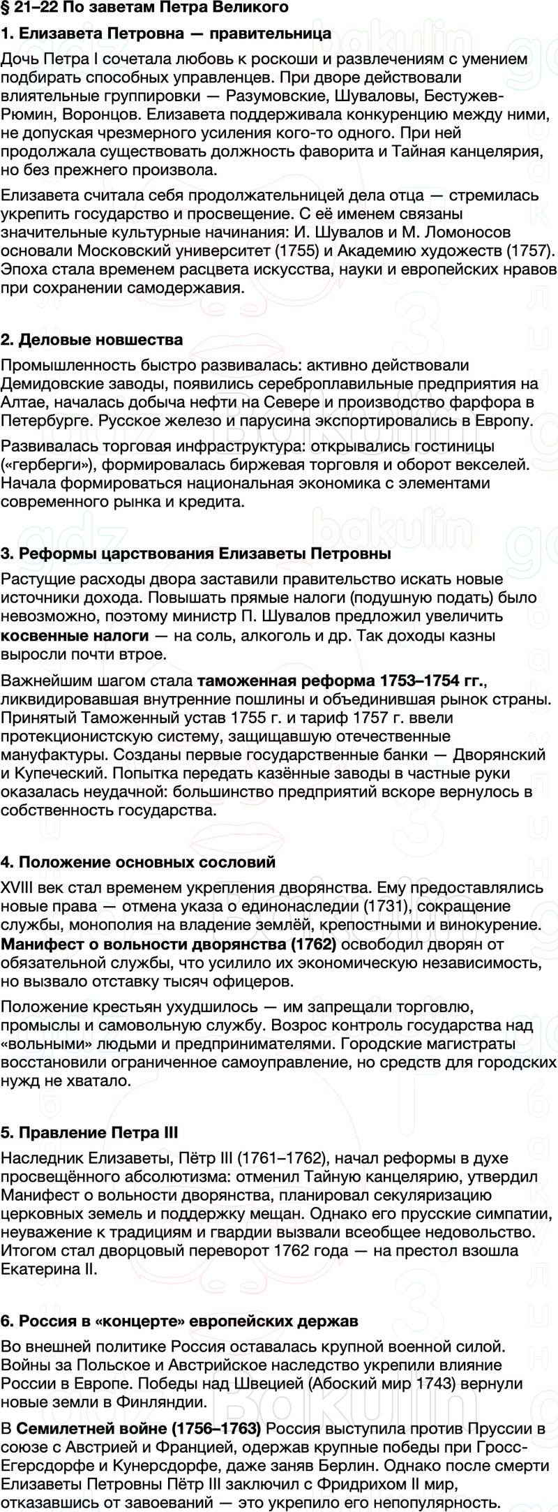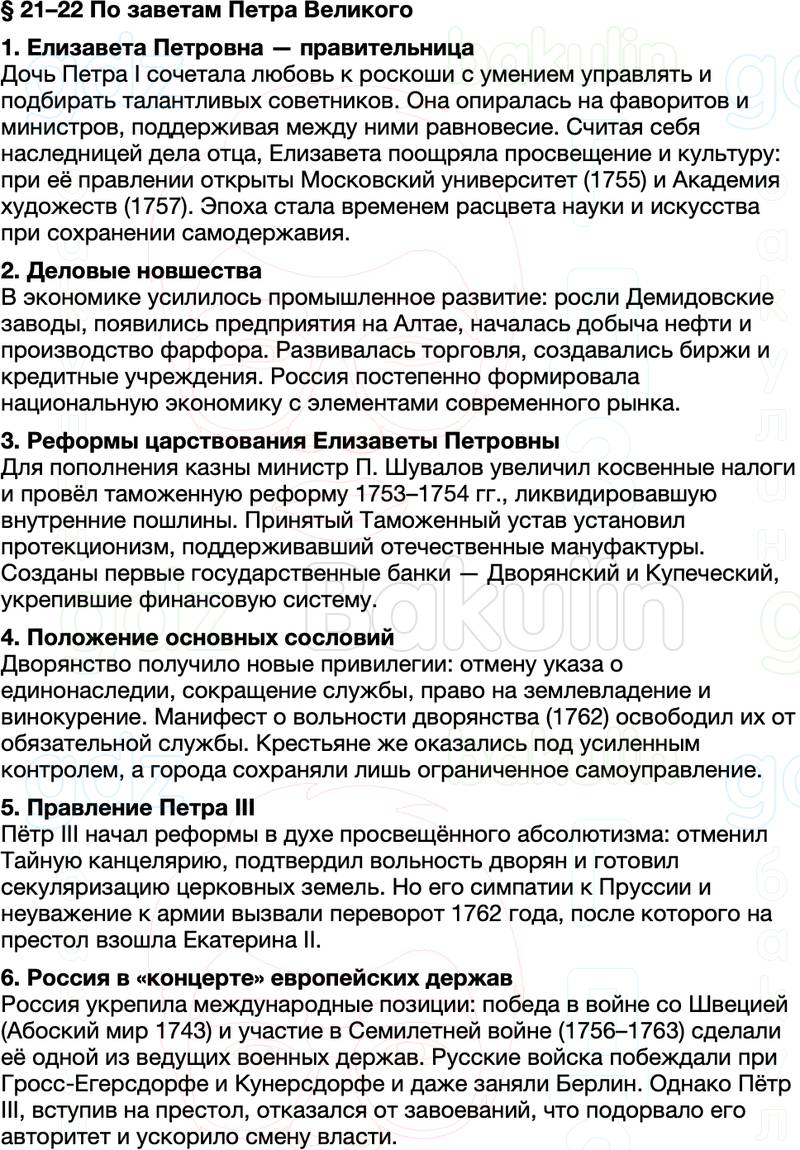Краткое содержание §21–22. По заветам Петра Великого по истории России 8 класс Мединский, Торкунов представлено в двух видах: развернутое и кратчайшее содержание параграфа. Скорость прочтения материала от 3 до 7 минут.