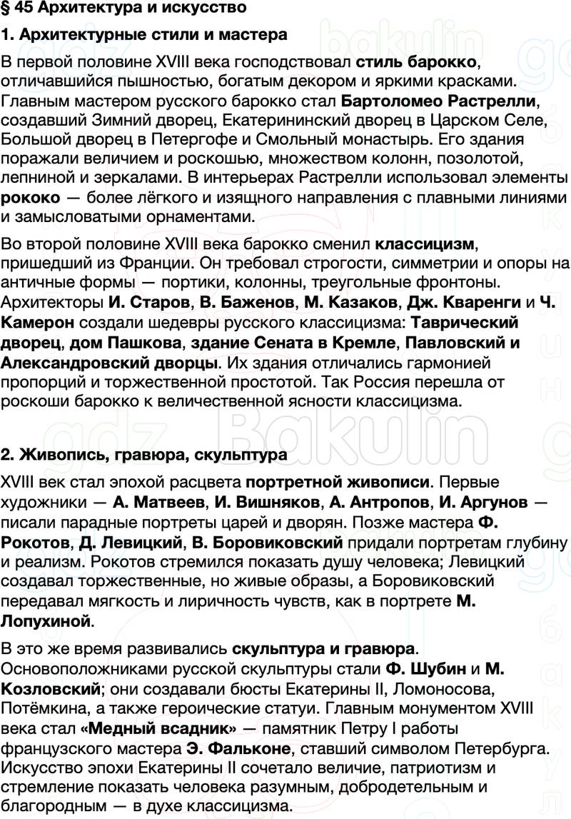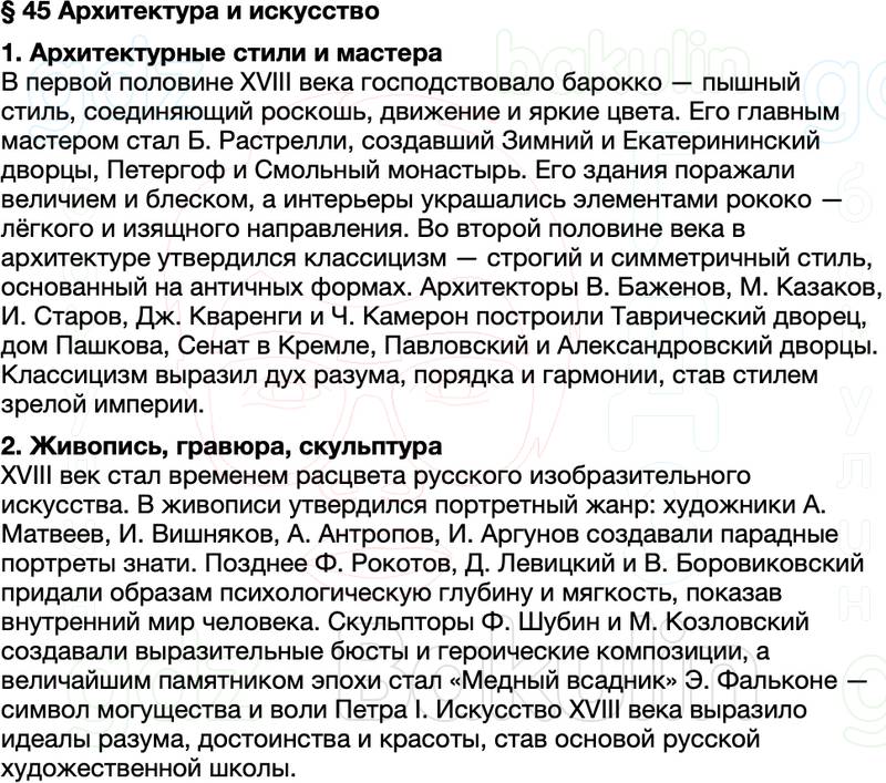 Краткое содержание §45. Архитектура и искусство по истории России 8 класс Мединский, Торкунов представлено в двух видах: развернутое и кратчайшее содержание параграфа. Скорость прочтения материала от 3 до 7 минут.