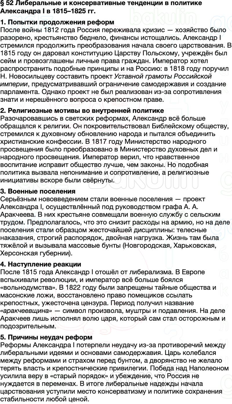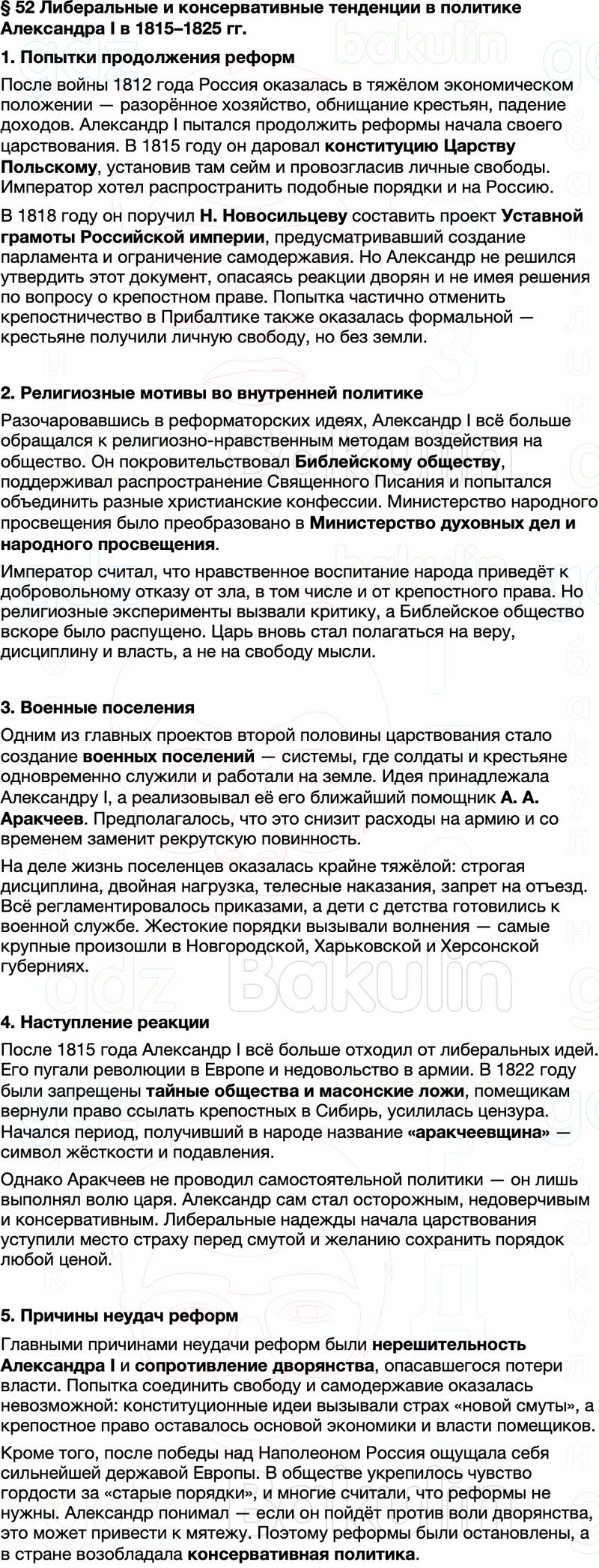 Краткое содержание §52. Либеральные и консервативные тенденции в политике Александра I в 1815–1825 гг. по истории России 8 класс Мединский, Торкунов представлено в двух видах: развернутое и кратчайшее содержание параграфа. Скорость прочтения материала от 3 до 7 минут.