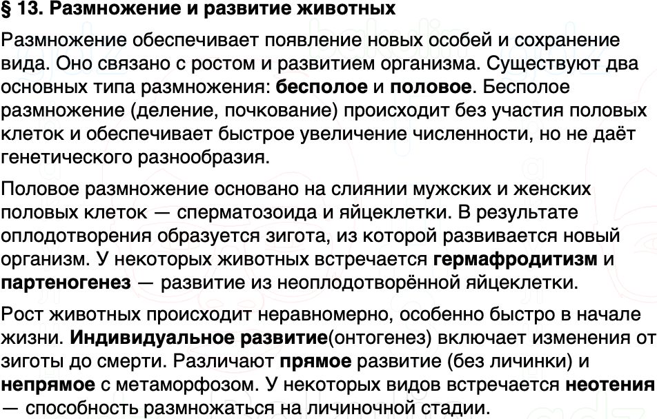 Краткое содержание Параграф 13 Размножение и развитие животных