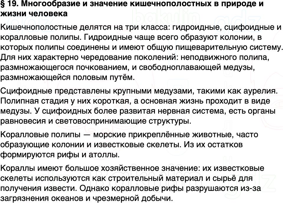 Краткое содержание Параграф 19 Многообразие и значение кишечнополостных в природе и жизни человека