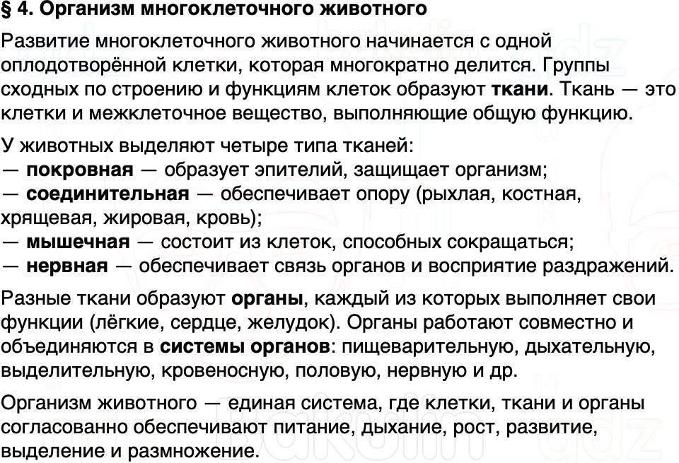 Краткое содержание Параграф 4 Организм многоклеточного животного