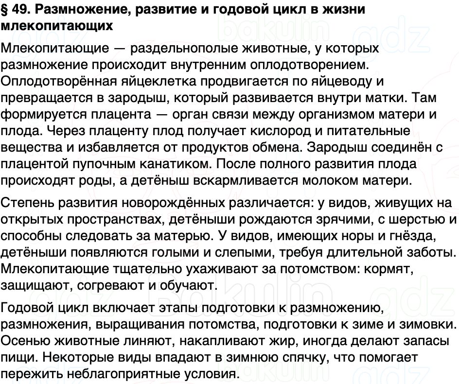 Краткое содержание Параграф 49 Размножение, развитие и годовой цикл в жизни млекопитающих