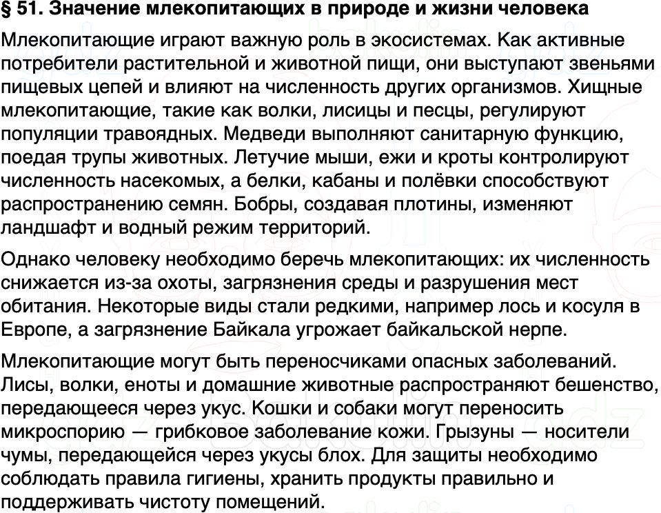 Краткое содержание Параграф 51 Значение млекопитающих в природе и жизни человека