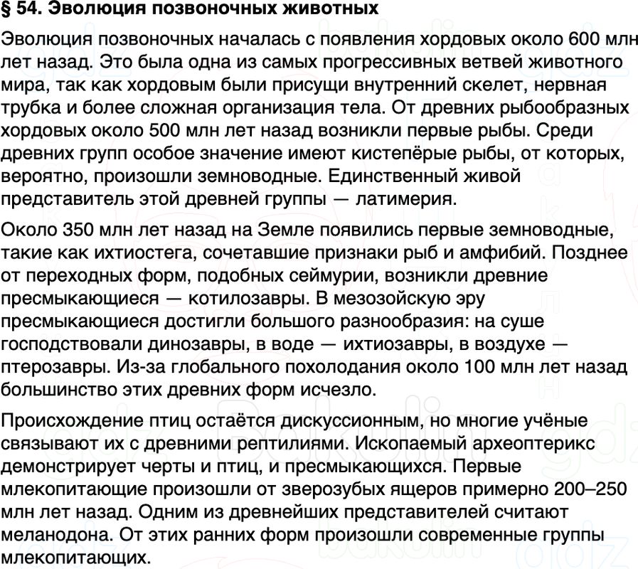 Краткое содержание Параграф 54 Эволюция позвоночных животных