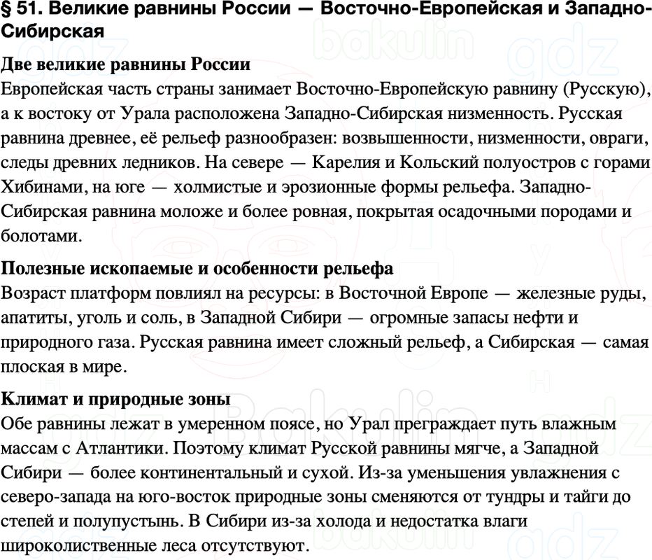 Краткое содержание пересказ Параграф 51. Великие равнины России — Восточно-Европейская и Западно-Сибирская География 8 класс Алексеев, Николина Полярная звезда