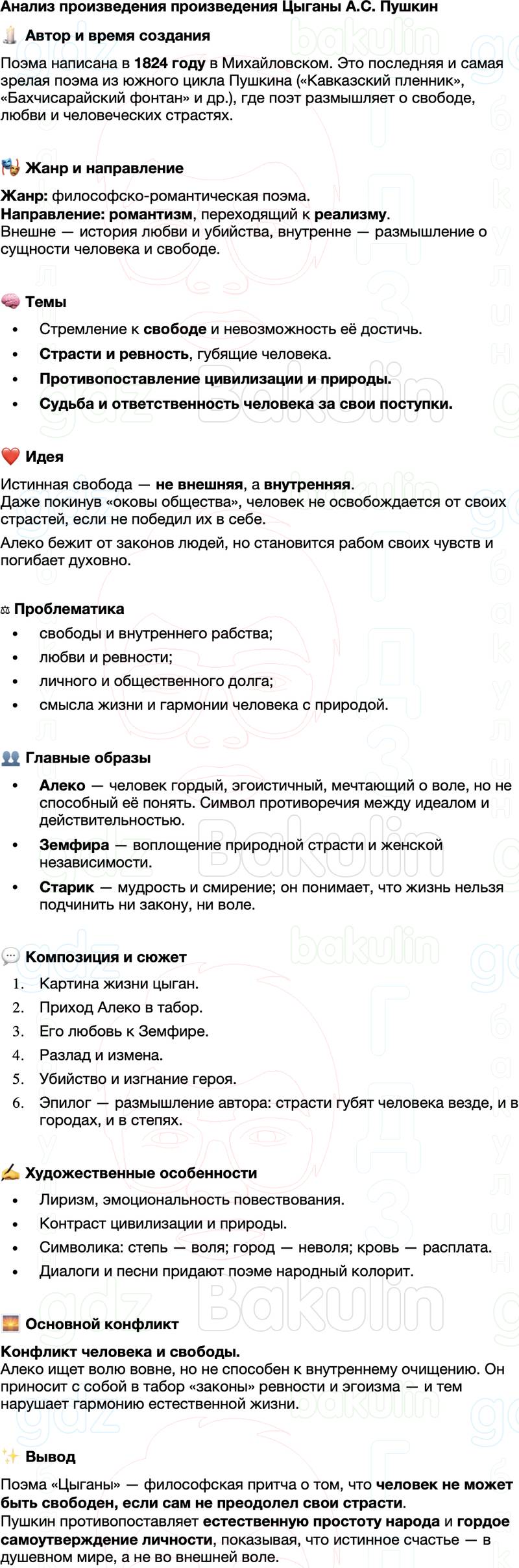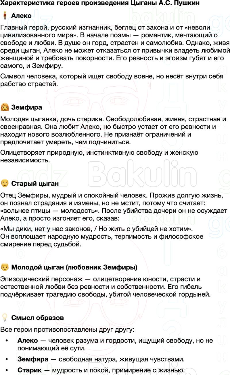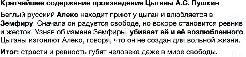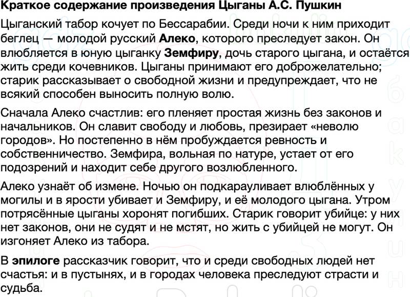 На странице представлено краткое (до 10 минут чтения) и кратчайшее (до 2 минут чтения) содержания литературного произведения А. С. Пушкина Цыганы. Мы также разработали характеристику всех героев, сделали подробный анализ прочитанного. Прочитав и изучив эти материалы, можно смело поднимать руку на уроке вверх и получать лучшие оценки! Краткое содержание, анализ произведения, характеристика героев полностью бесплатны.