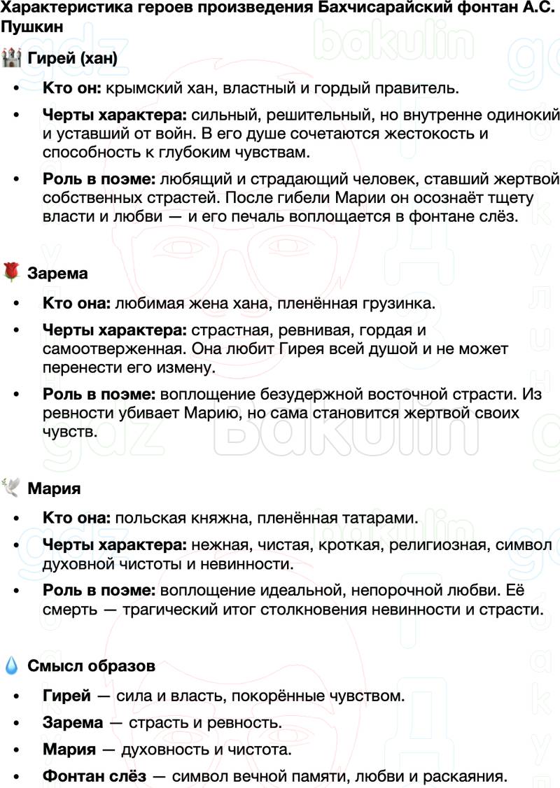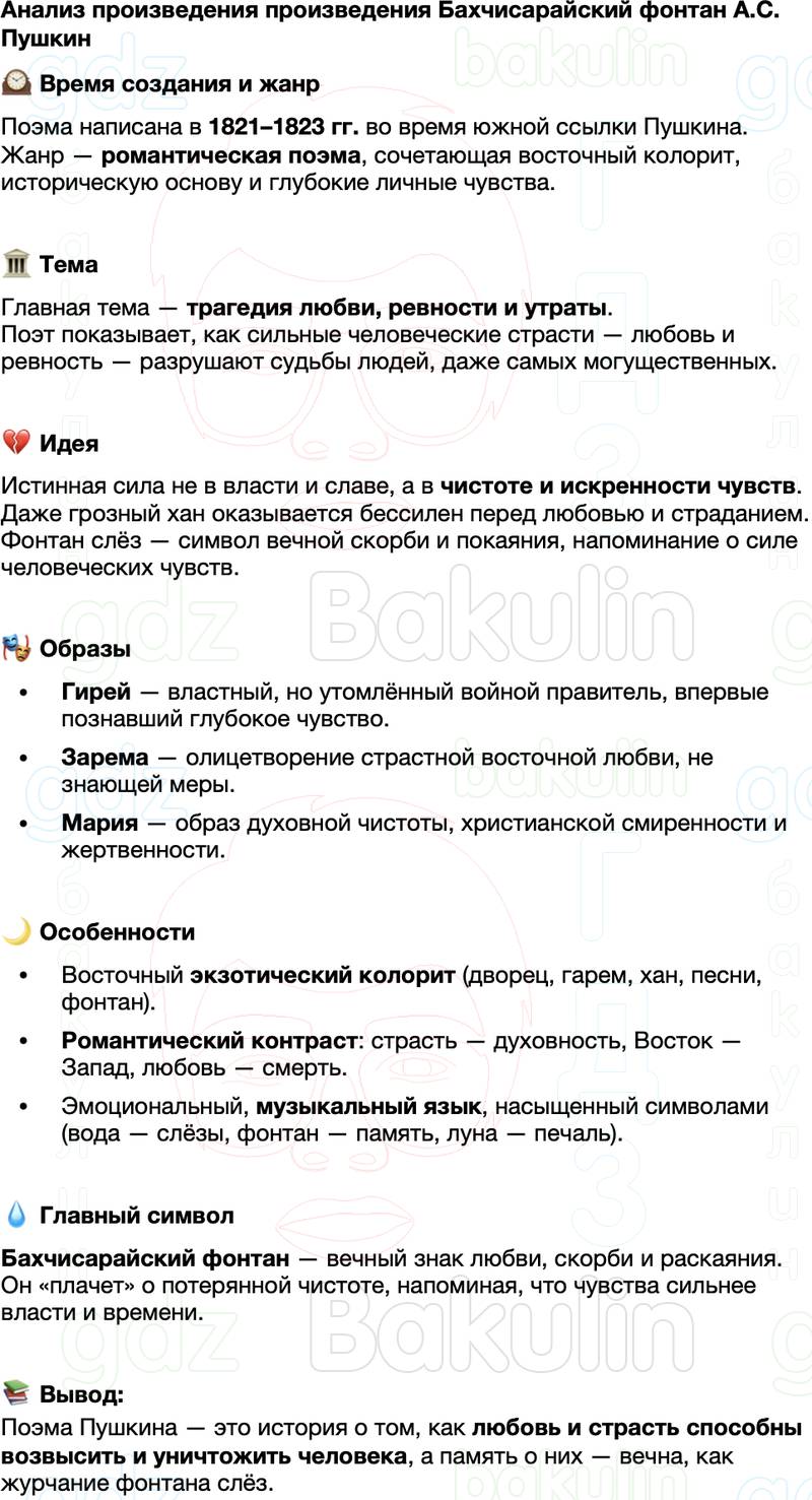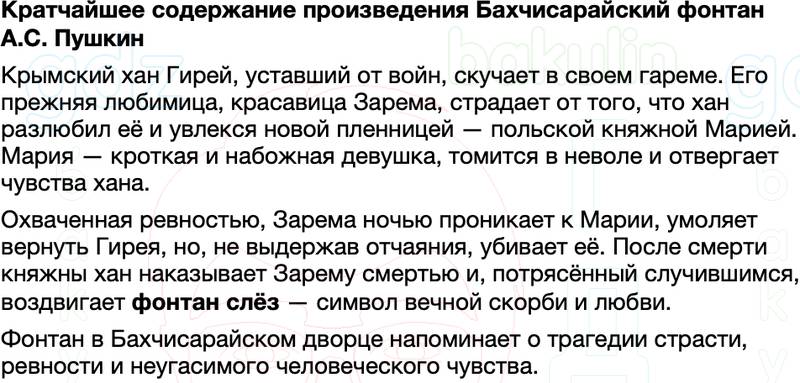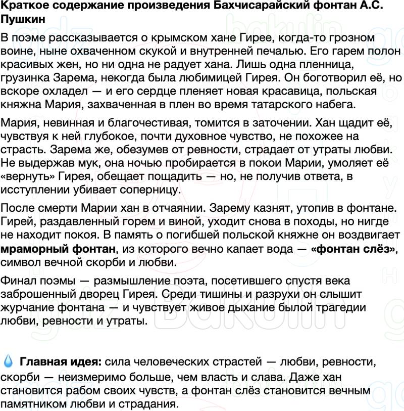 На странице представлено краткое (до 10 минут чтения) и кратчайшее (до 2 минут чтения) содержания литературного произведения А. С. Пушкина Бахчисарайский фонтан. Мы также разработали характеристику всех героев, сделали подробный анализ прочитанного. Прочитав и изучив эти материалы, можно смело поднимать руку на уроке вверх и получать лучшие оценки! Краткое содержание, анализ произведения, характеристика героев полностью бесплатны.