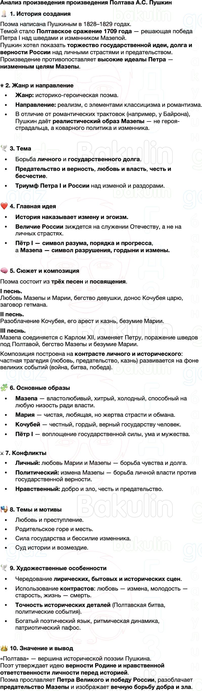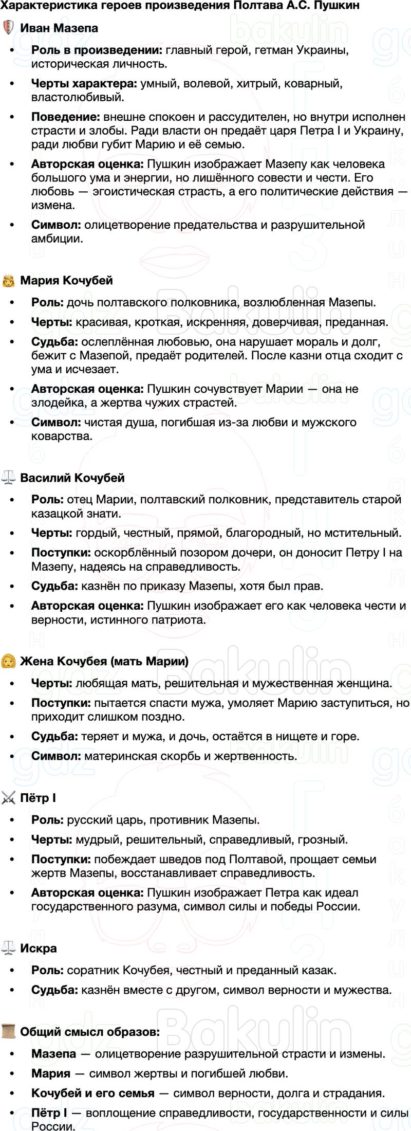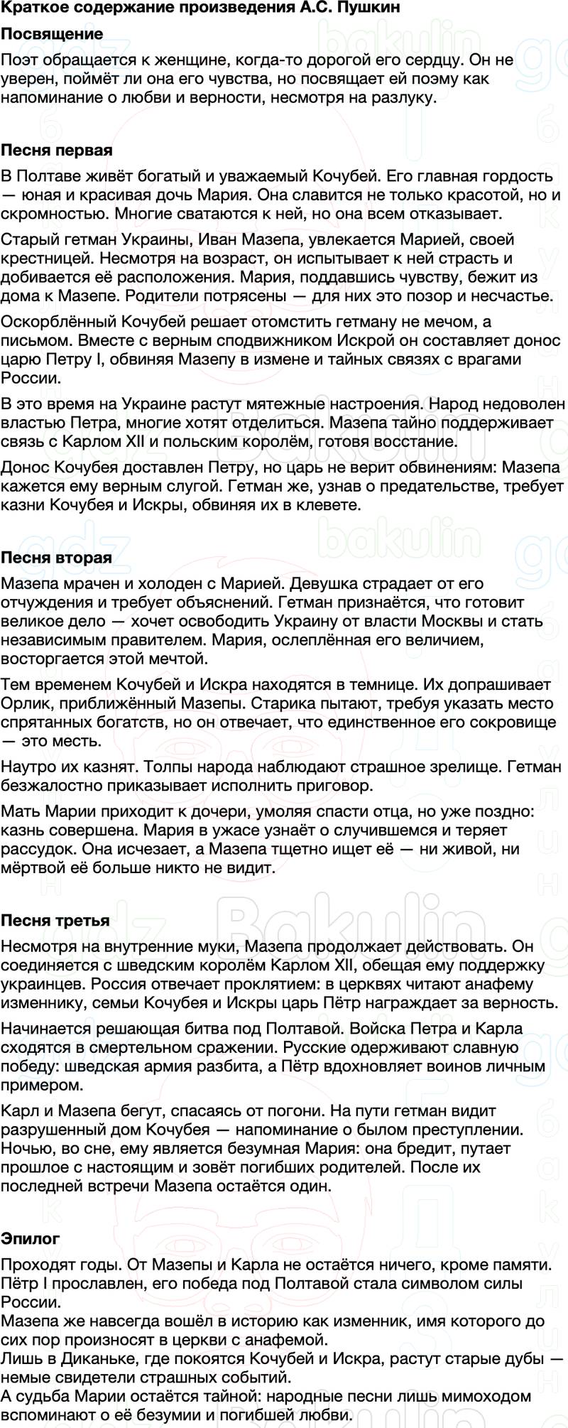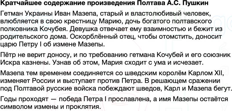 На странице представлено краткое (до 10 минут чтения) и кратчайшее (до 2 минут чтения) содержания литературного произведения А. С. Пушкина Полтава. Мы также разработали характеристику всех героев, сделали подробный анализ прочитанного. Прочитав и изучив эти материалы, можно смело поднимать руку на уроке вверх и получать лучшие оценки! Краткое содержание, анализ произведения, характеристика героев полностью бесплатны.