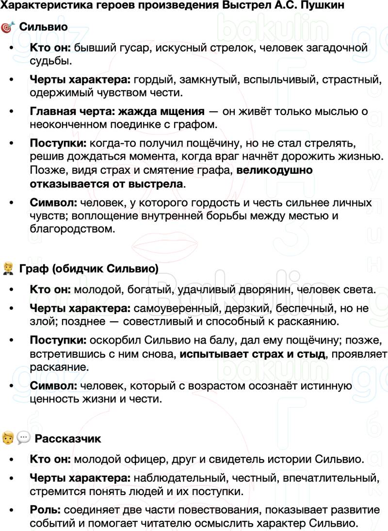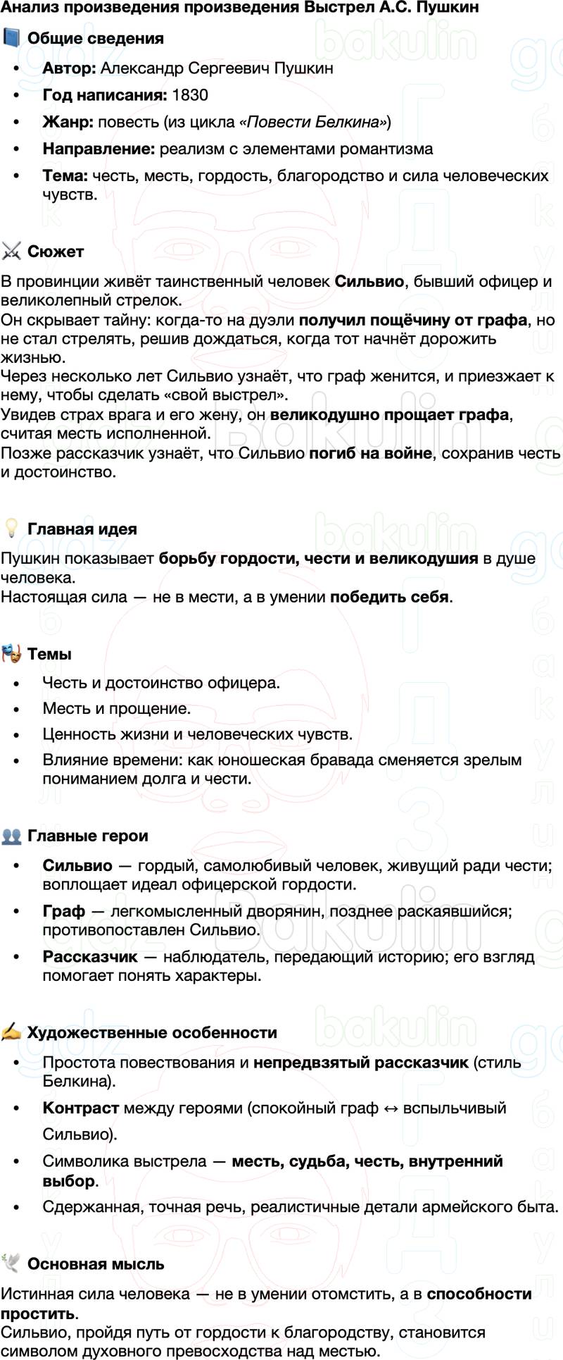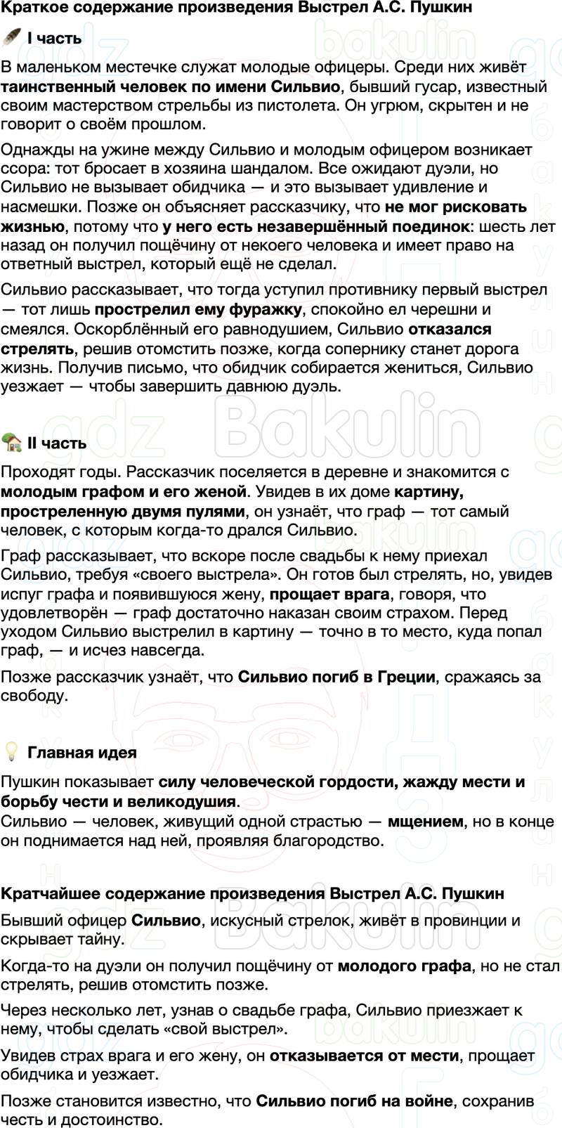 На странице представлено краткое (до 10 минут чтения) и кратчайшее (до 2 минут чтения) содержания литературного произведения А. С. Пушкина Выстрел. Мы также разработали характеристику всех героев, сделали подробный анализ прочитанного. Прочитав и изучив эти материалы, можно смело поднимать руку на уроке вверх и получать лучшие оценки! Краткое содержание, анализ произведения, характеристика героев полностью бесплатны.