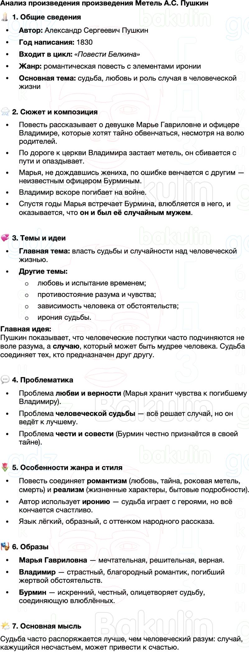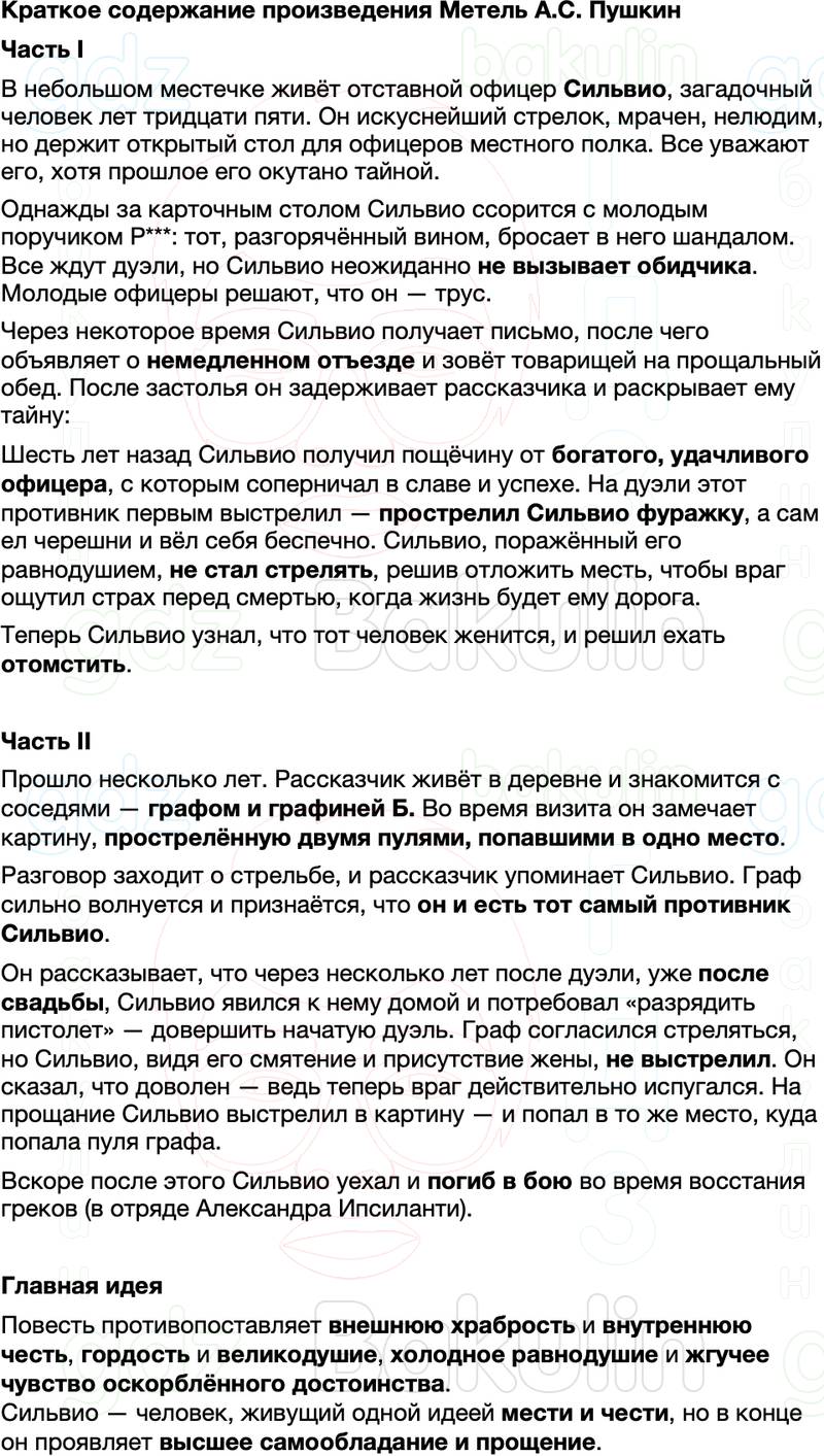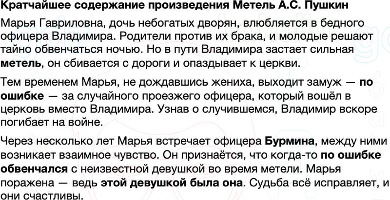 На странице представлено краткое (до 10 минут чтения) и кратчайшее (до 2 минут чтения) содержания литературного произведения А. С. Пушкина Метель. Мы также разработали характеристику всех героев, сделали подробный анализ прочитанного. Прочитав и изучив эти материалы, можно смело поднимать руку на уроке вверх и получать лучшие оценки! Краткое содержание, анализ произведения, характеристика героев полностью бесплатны.