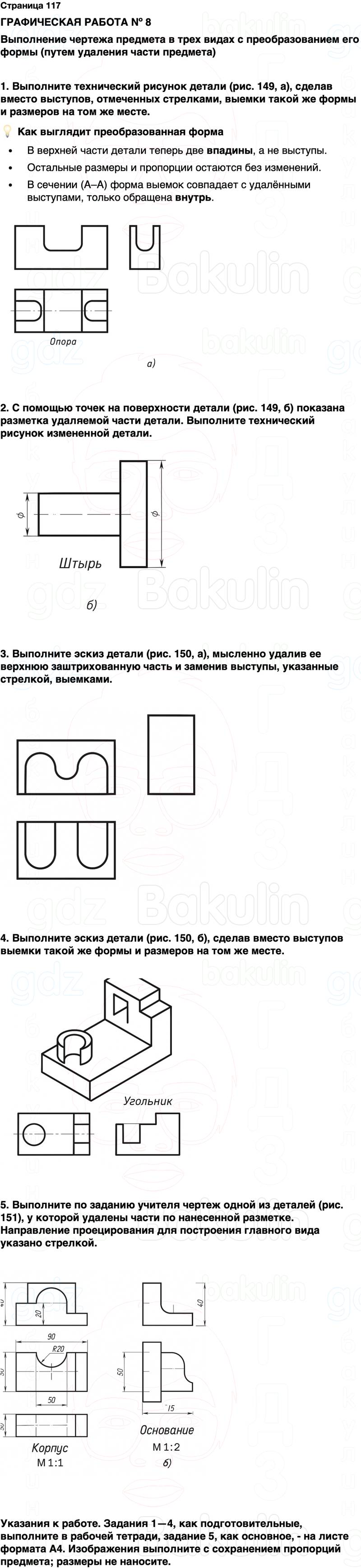 1. Выполните технический рисунок детали (рис. 149, а), сделав вместо выступов, отмеченных стрелками, выемки такой же формы и размеров на том же месте.