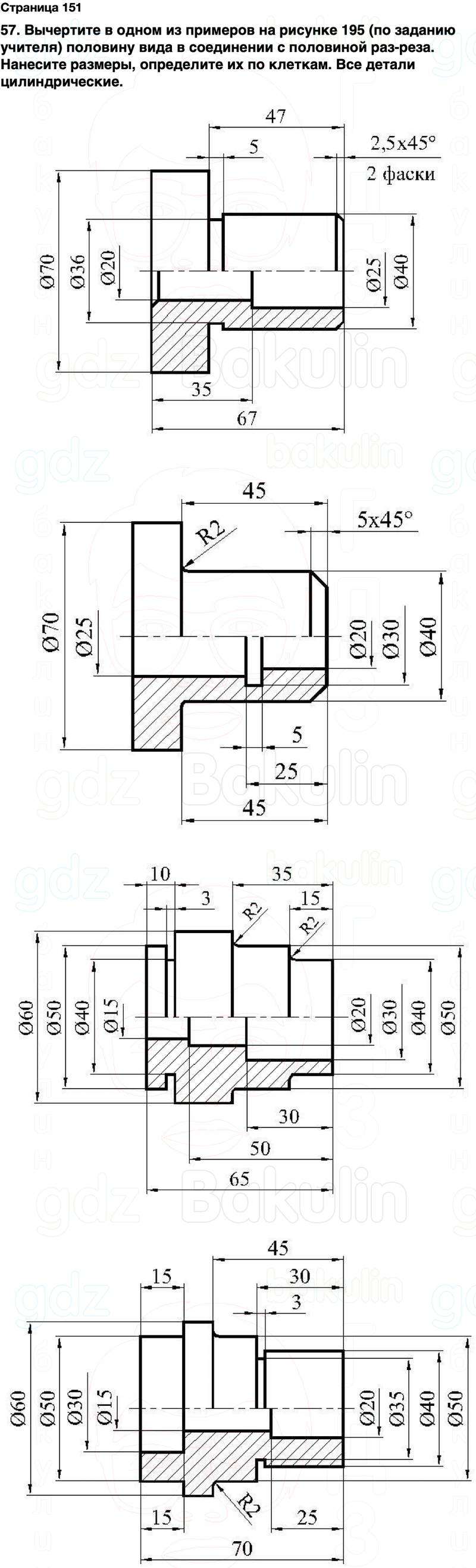 57. Вычертите в одном из примеров на рисунке 195 (по заданию учителя) половину вида в соединении с половиной раз-реза. Нанесите размеры, определите их по клеткам. Все детали цилиндрические.