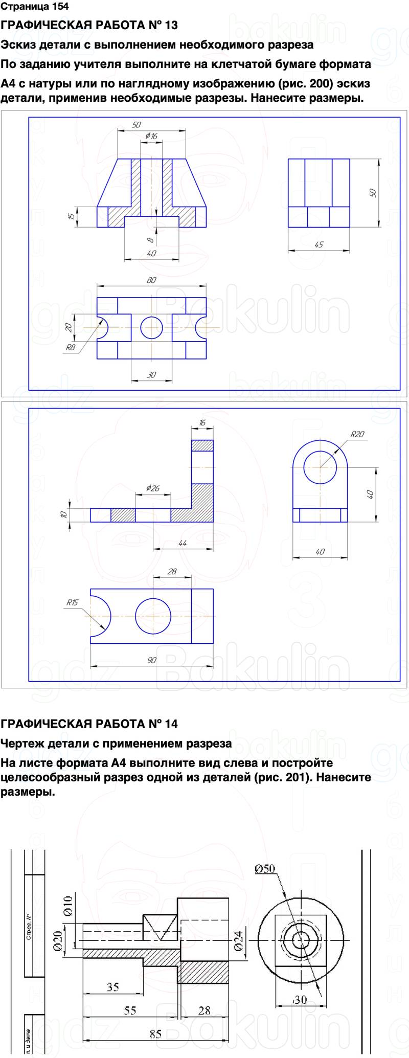 На листе формата A4 выполните вид слева и постройте целесообразный разрез одной из деталей (рис. 201). Нанесите размеры.