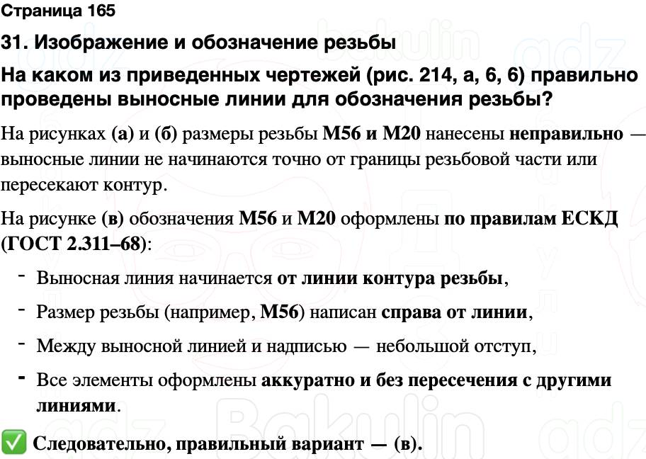 На каком из приведенных чертежей (рис. 214, а, 6, 6) правильно проведены выносные линии для обозначения резьбы?