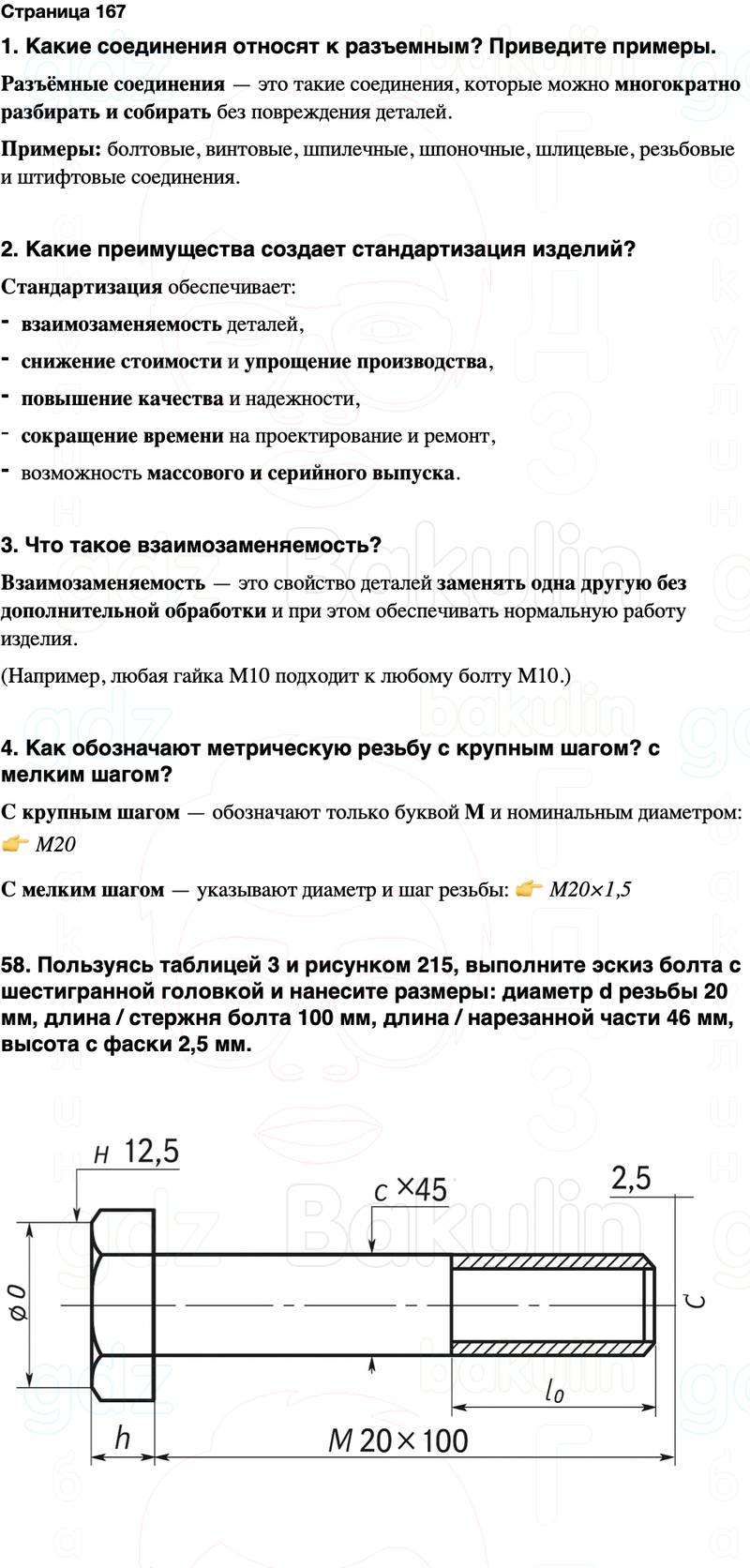 58. Пользуясь таблицей 3 и рисунком 215, выполните эскиз болта с шестигранной головкой и нанесите размеры: диаметр d резьбы 20 мм, длина / стержня болта 100 мм, длина / нарезанной части 46 мм, высота с фаски 2,5 мм.