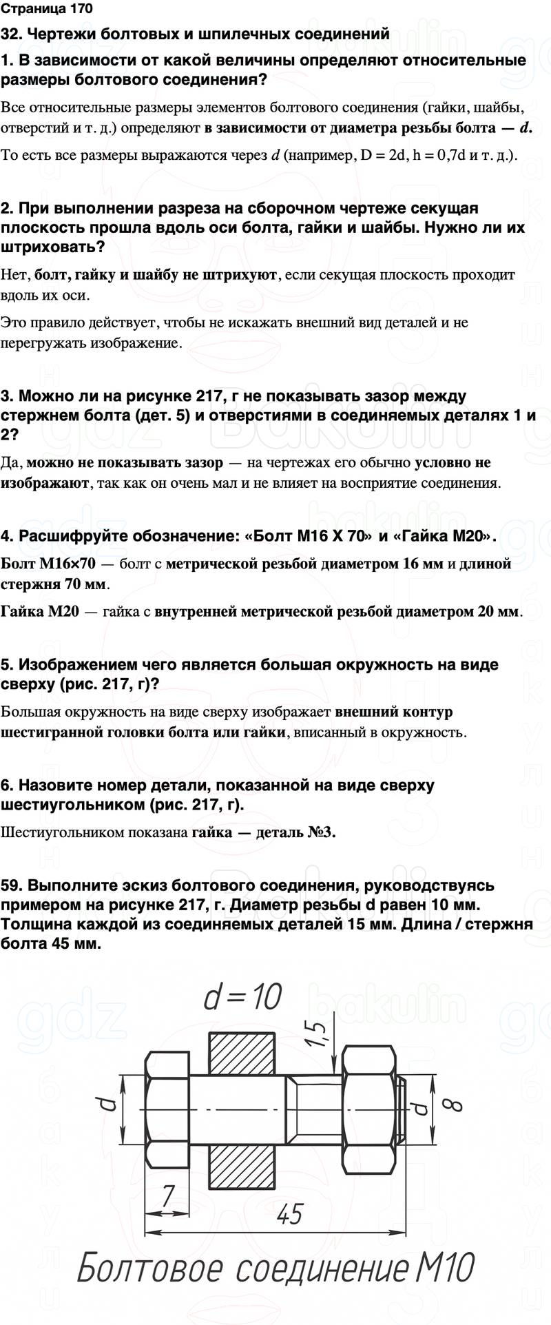 59. Выполните эскиз болтового соединения, руководствуясь примером на рисунке 217, г. Диаметр резьбы d равен 10 мм. Толщина каждой из соединяемых деталей 15 мм. Длина / стержня болта 45 мм.