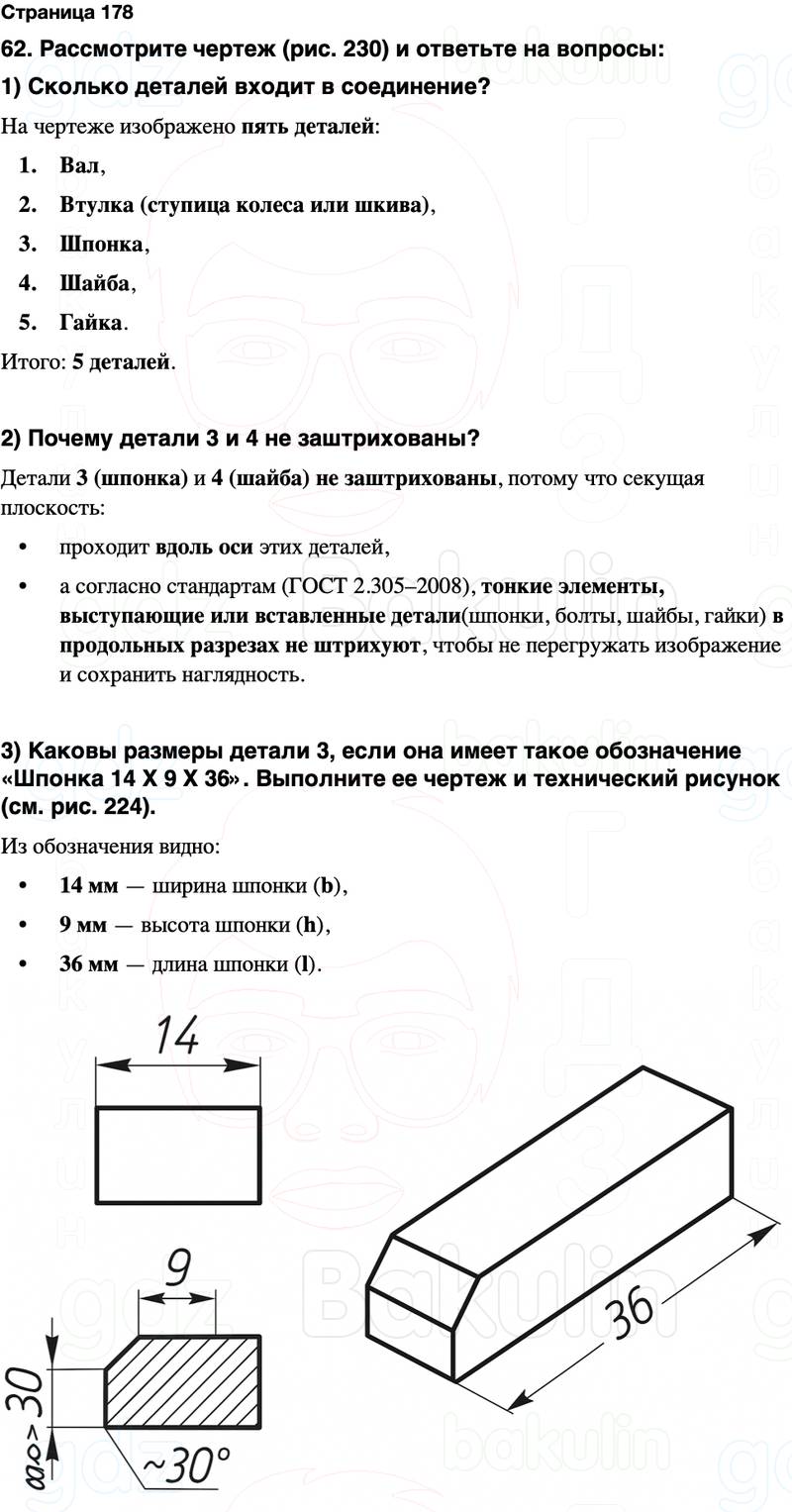 3) Каковы размеры детали 3, если она имеет такое обозначение «Шпонка 14 Х 9 Х 36». Выполните ее чертеж и технический рисунок (см. рис. 224).