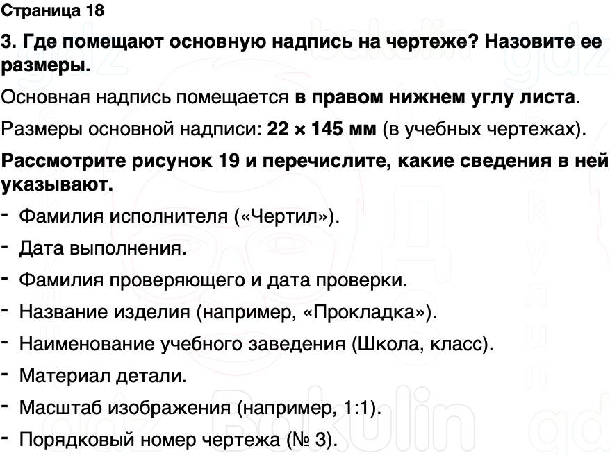 3. Где помещают основную надпись на чертеже? Назовите ее размеры. Рассмотрите рисунок 19 и перечислите, какие сведения в ней указывают.