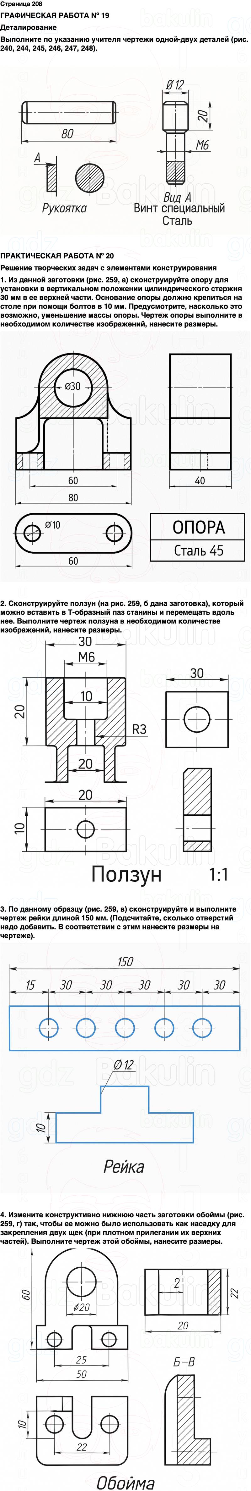 Выполните по указанию учителя чертежи одной-двух деталей (рис. 240, 244, 245, 246, 247, 248).