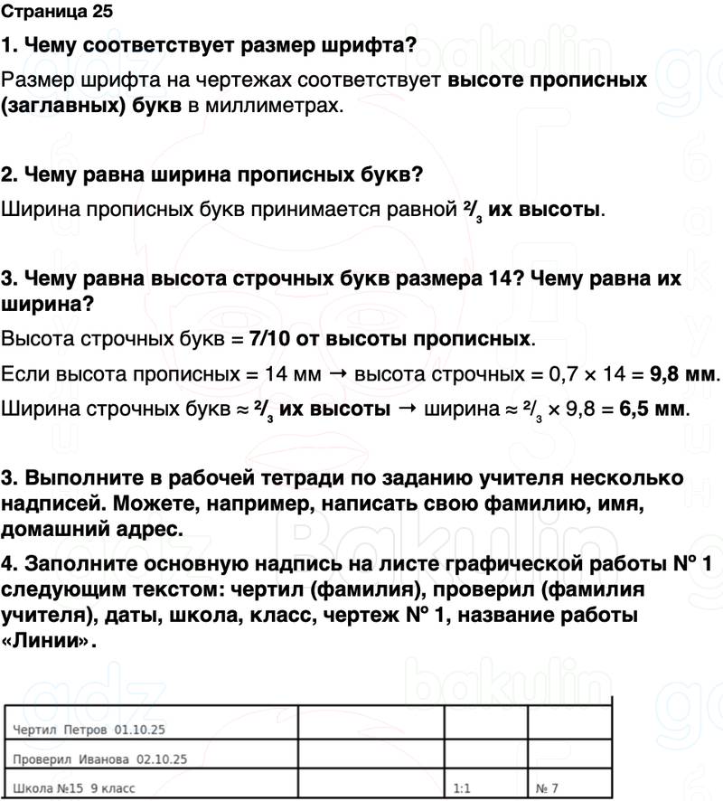 4. Заполните основную надпись на листе графической работы Nº 1 следующим текстом: чертил (фамилия), проверил (фамилия учителя), даты, школа, класс, чертеж Nº 1, название работы «Линии».