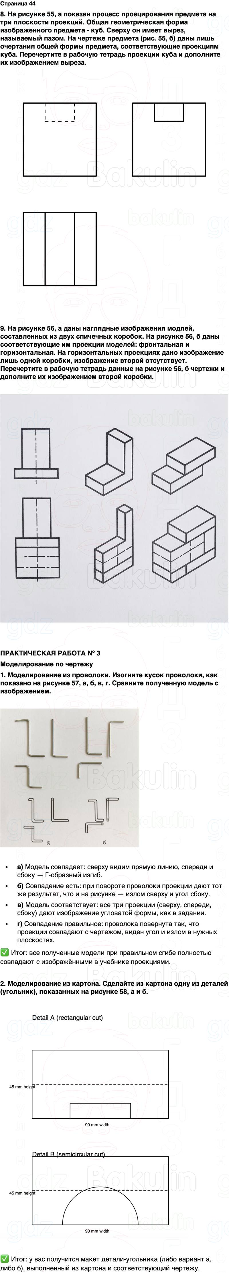 8. На рисунке 55, а показан процесс проецирования предмета на три плоскости проекций. Общая геометрическая форма изображенного предмета - куб. Сверху он имеет вырез, называемый пазом. На чертеже предмета (рис. 55, б) даны лишь очертания общей формы предмета, соответствующие проекциям куба. Перечертите в рабочую тетрадь проекции куба и дополните их изображением выреза.