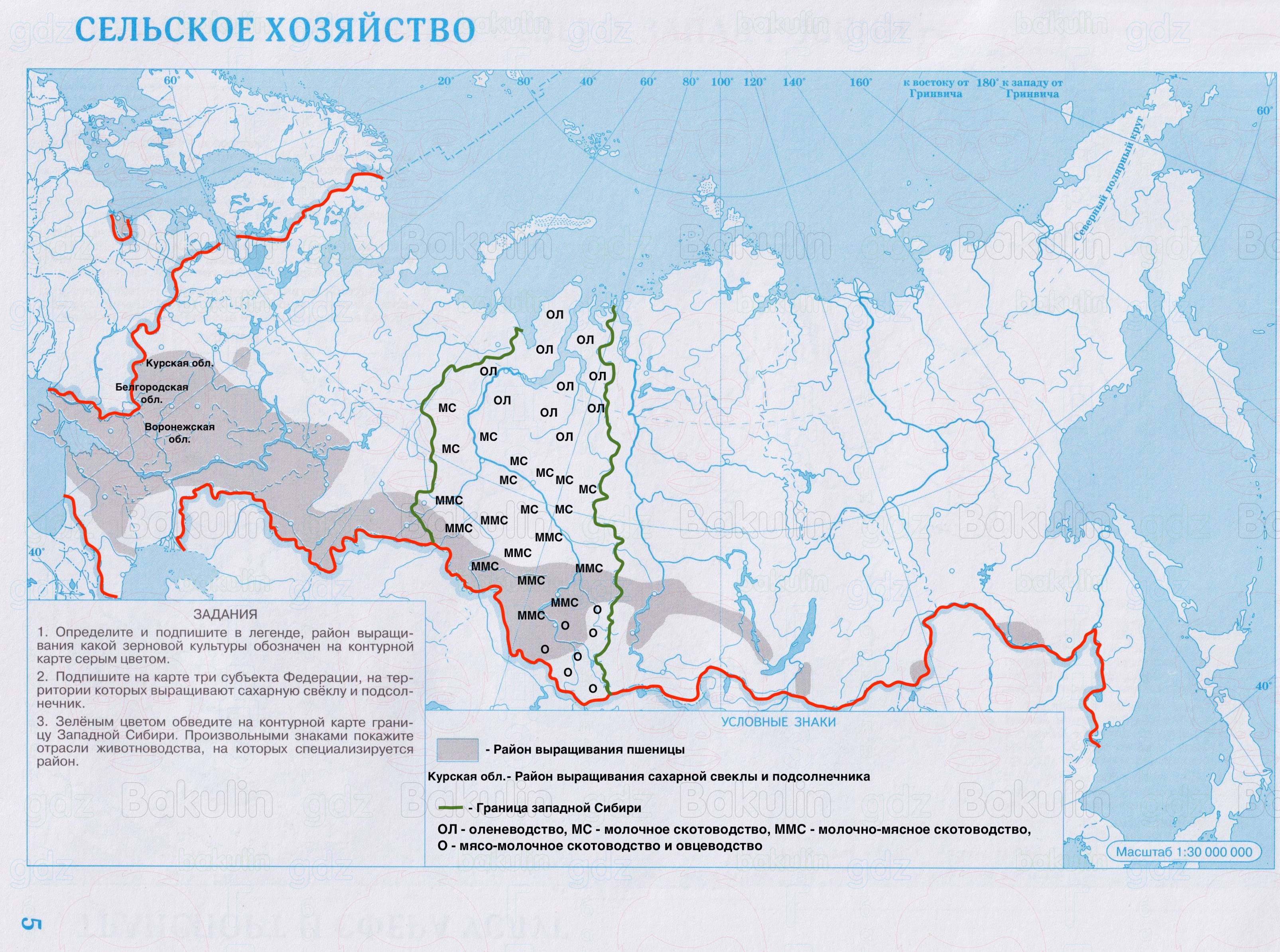 Зелёным цветом обведите на контурной карте границу Западной Сибири. Произвольными знаками покажите отрасли животноводства, на которых специализируется район.