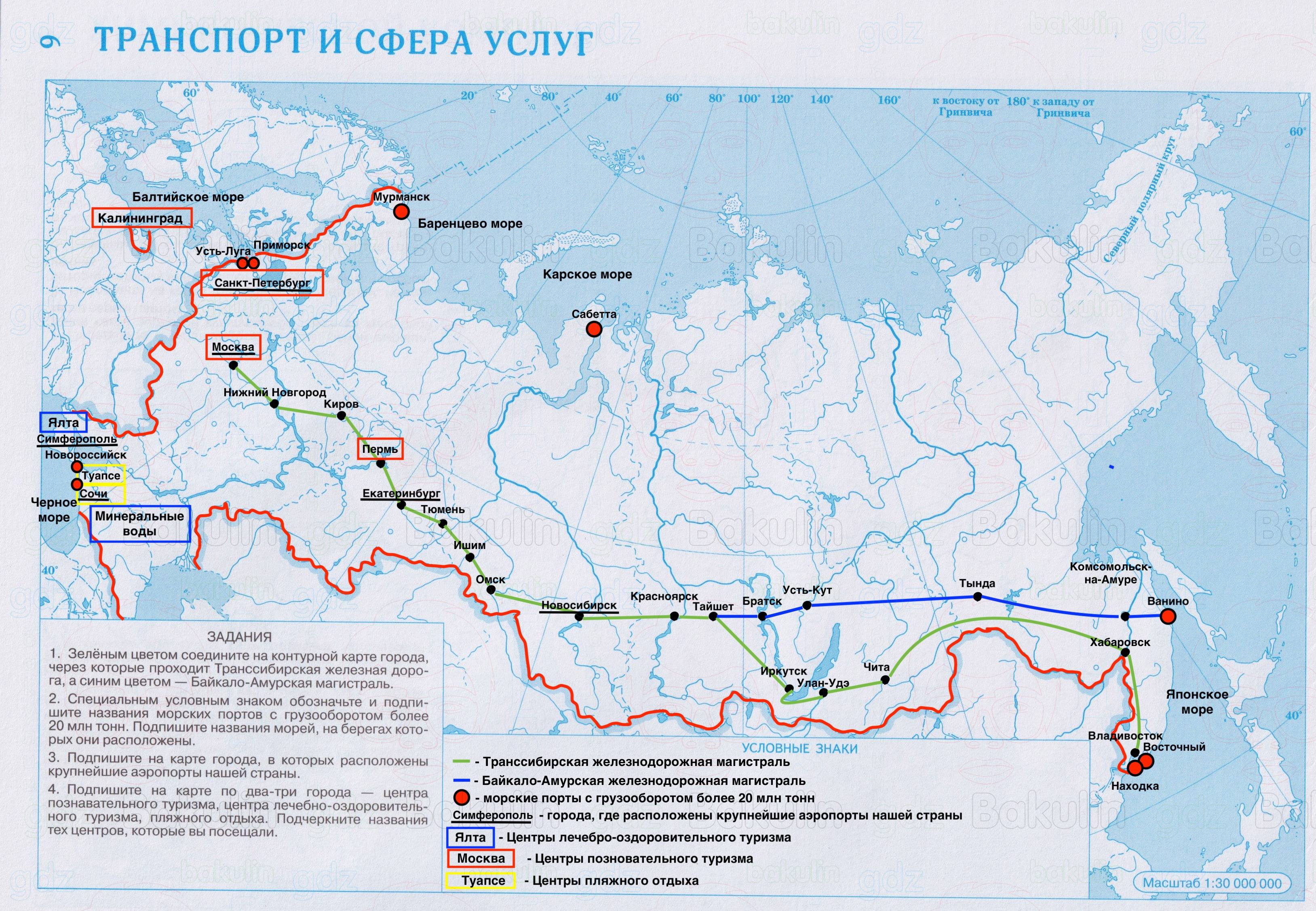 Специальным условным знаком обозначьте и подпи-шите названия морских портов с грузооборотом более 20 млн тонн. Подпишите названия морей, на берегах которых они расположены.