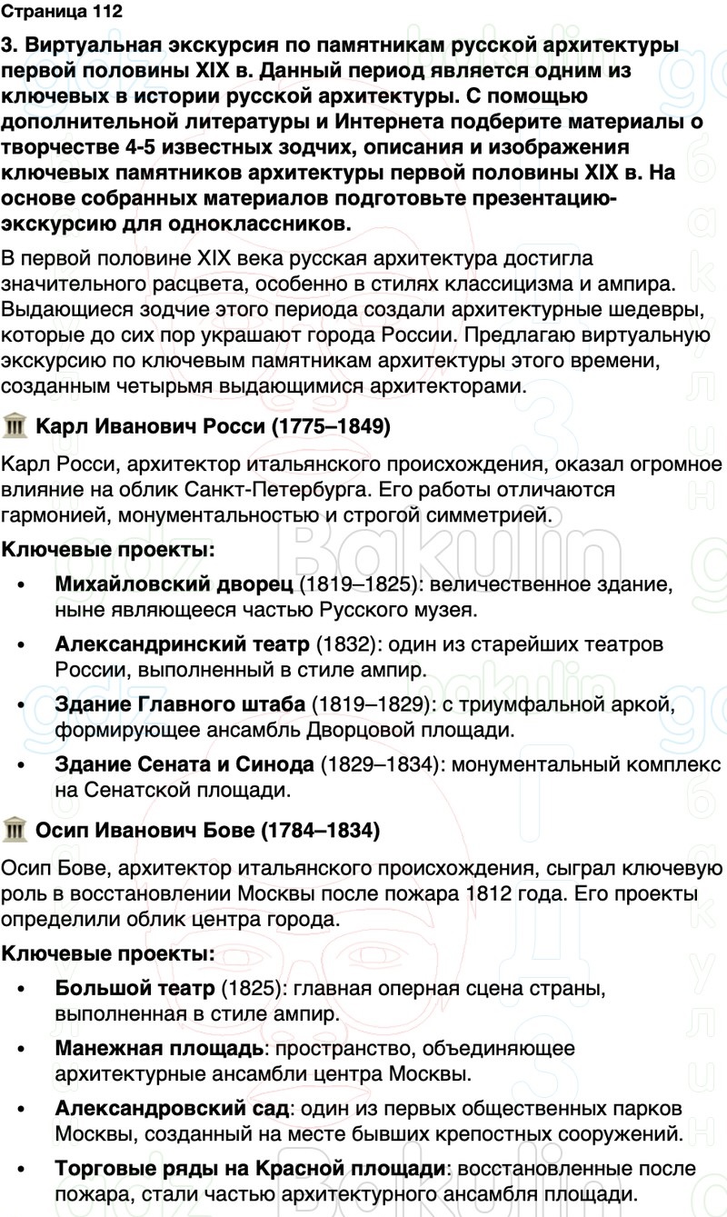3. Виртуальная экскурсия по памятникам русской архитектуры первой половины XIX в. Данный период является одним из ключевых в истории русской архитектуры. С помощью дополнительной литературы и Интернета подберите материалы о творчестве 4-5 известных зодчих, описания и изображения ключевых памятников архитектуры первой половины XIX в. На основе собранных материалов подготовьте презентацию-экскурсию для одноклассников.