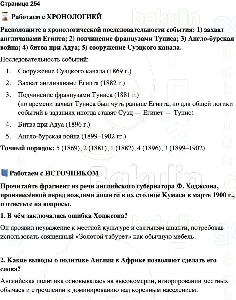 Расположите в хронологической последовательности события: 1) захват англичанами Египта; 2) подчинение французами Туниса; 3) Англо-бурская война; 4) битва при Адуа; 5) сооружение Суэцкого канала.