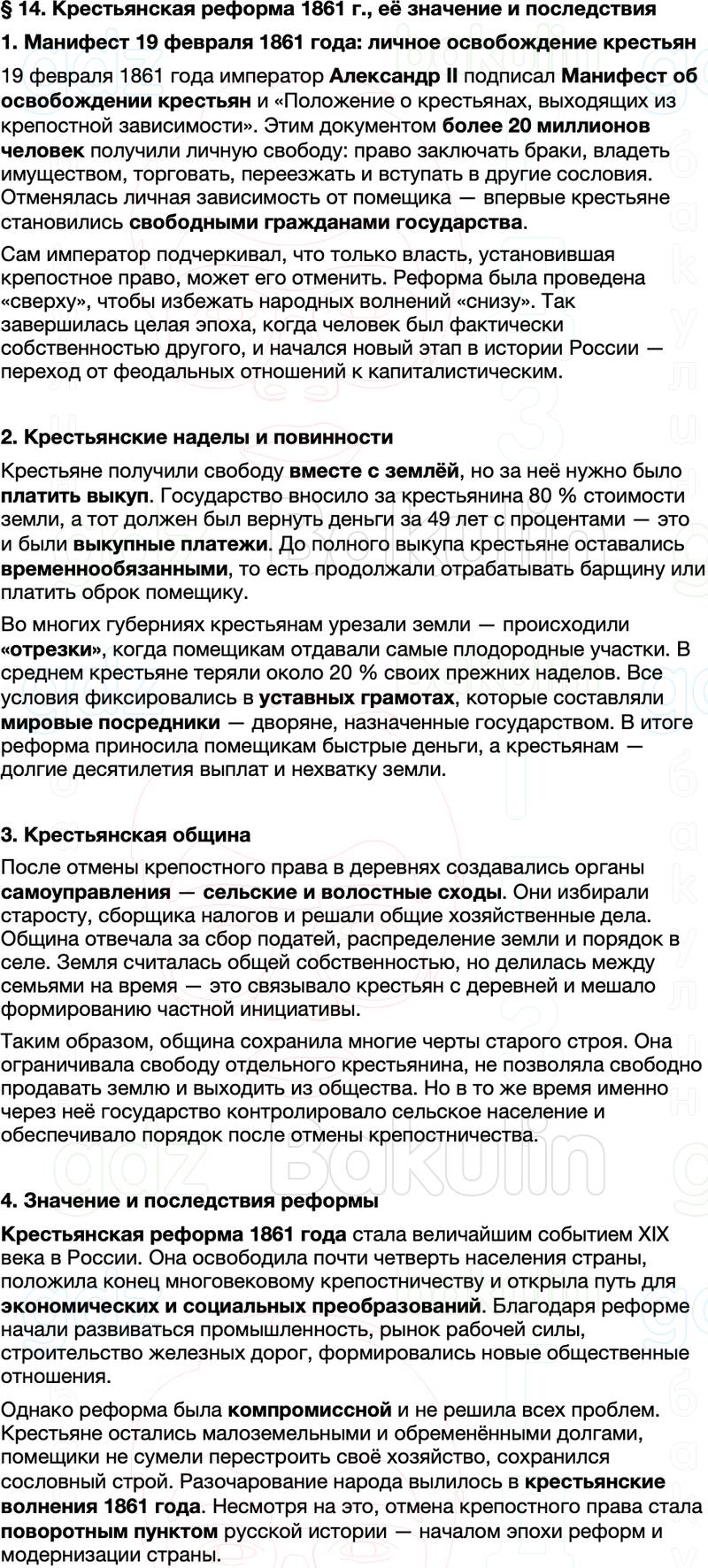 Краткое содержание §14. Крестьянская реформа 1861 г., её значение и последствия по истории России 9 класс Мединский, Торкунов представлено в двух видах: развернутое и кратчайшее содержание параграфа. Скорость прочтения материала от 3 до 7 минут.