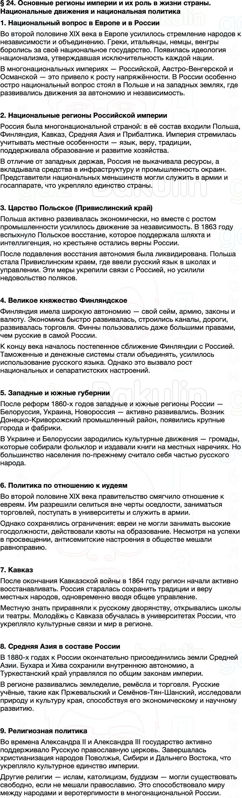 Краткое содержание §24. Основные регионы империи и их роль в жизни страны. Национальные движения и национальная политика по истории России 9 класс Мединский, Торкунов представлено в двух видах: развернутое и кратчайшее содержание параграфа. Скорость прочтения материала от 3 до 7 минут.