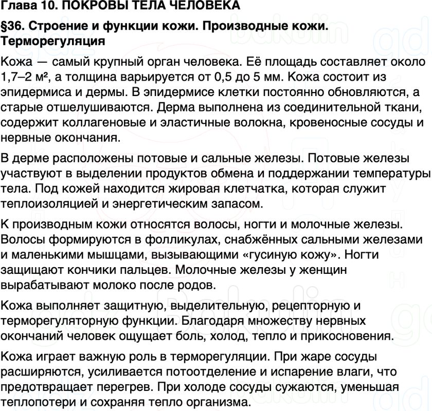 Краткое содержание Параграф 36 Строение и функции кожи Производные кожи Терморегуляция