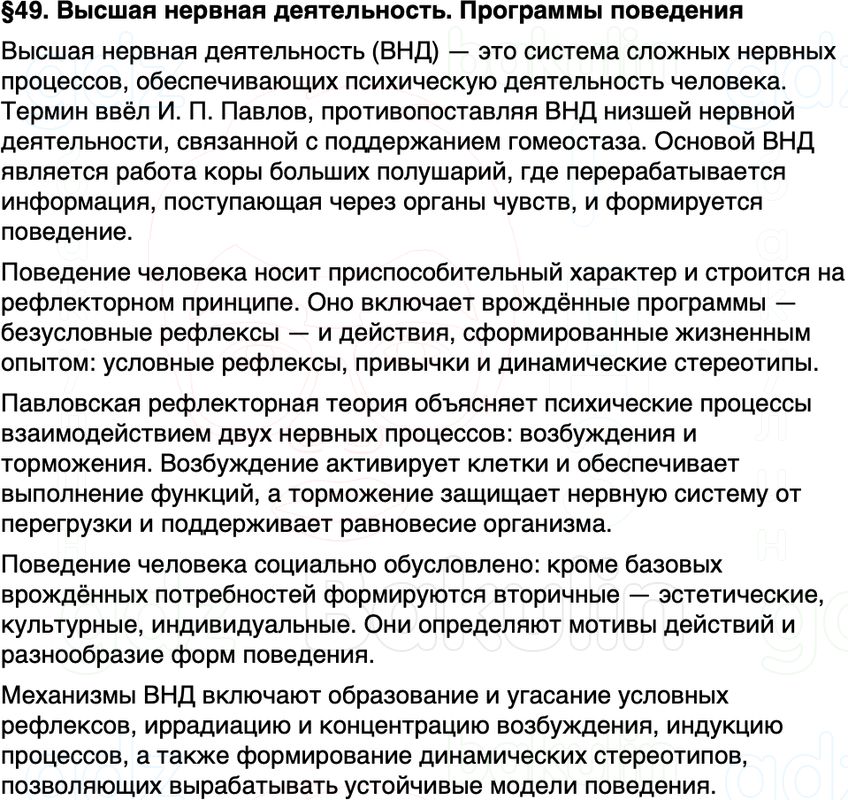 Краткое содержание Параграф 49 Высшая нервная деятельность Программы поведения