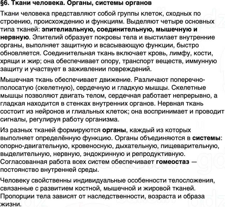 Краткое содержание Параграф 6 Ткани человека Органы, системы органов