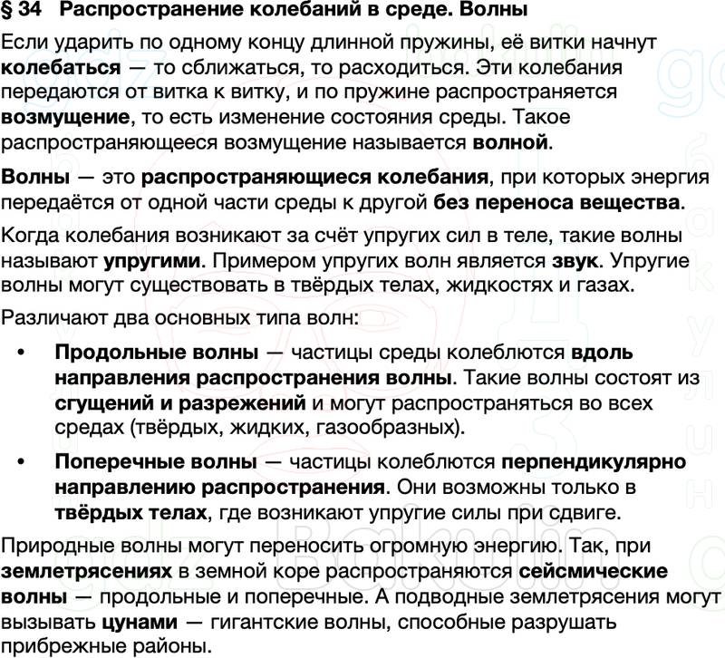 Краткое содержание Параграф 34 Распространение колебаний в среде. Волны Физика 9 класс Перышкин