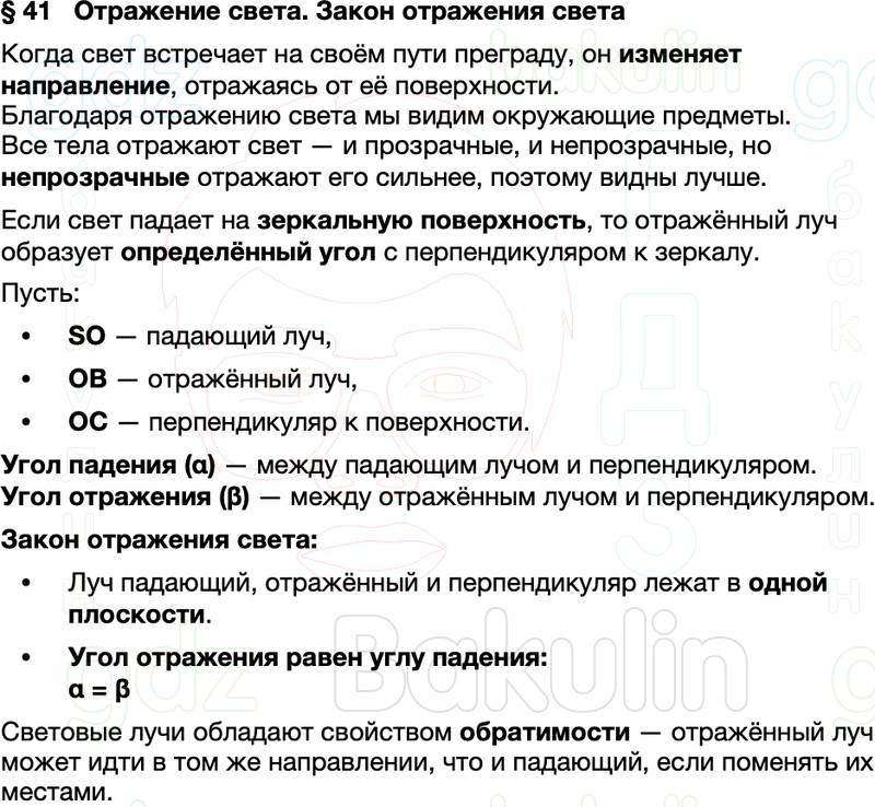 Краткое содержание Параграф 41 Отражение света. Закон отражения света Физика 9 класс Перышкин