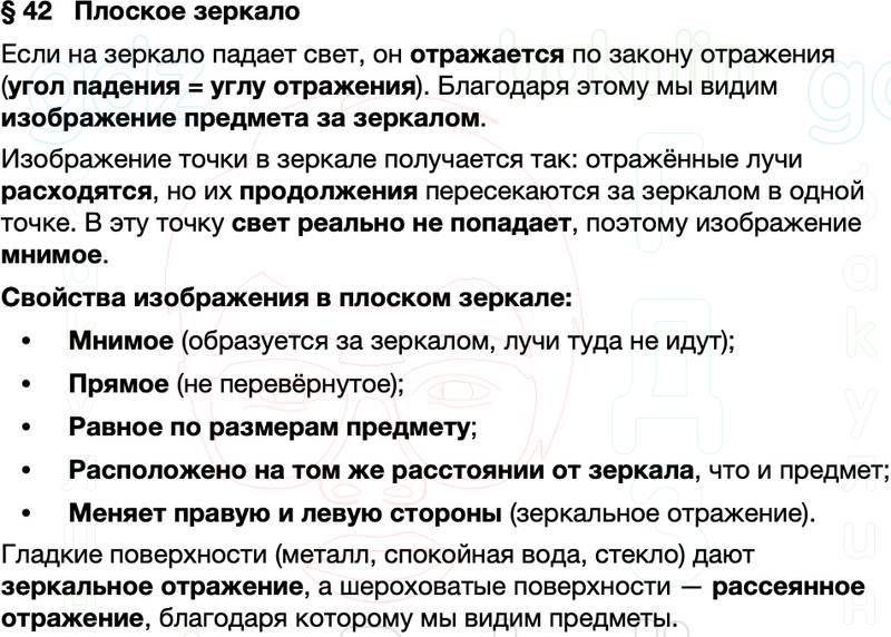 Краткое содержание Параграф 42 Плоское зеркало Физика 9 класс Перышкин
