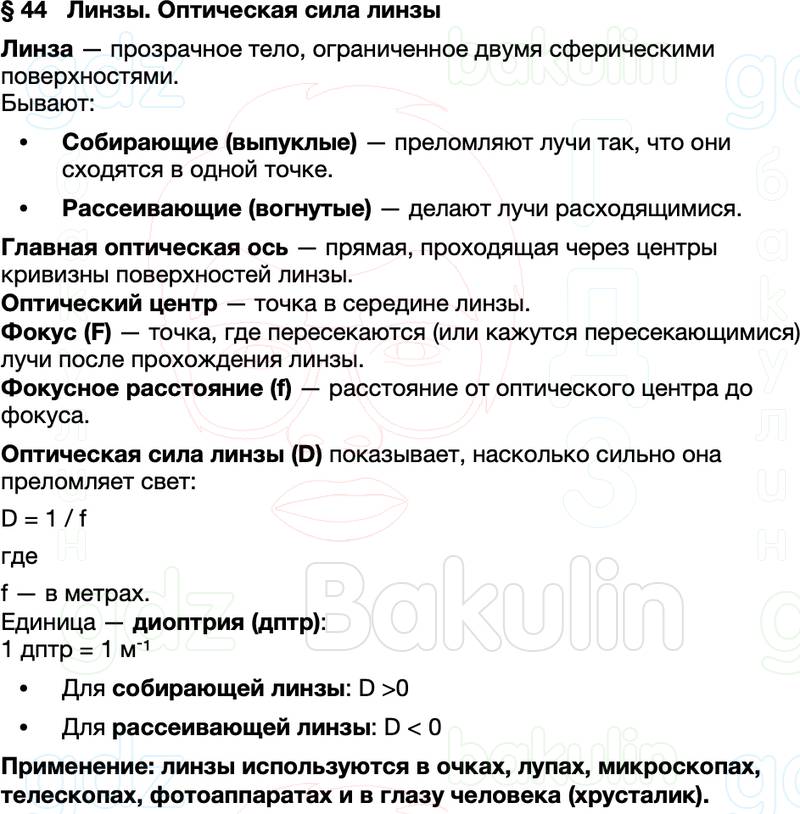 Краткое содержание Параграф 44 Линзы. Оптическая сила линзы Физика 9 класс Перышкин