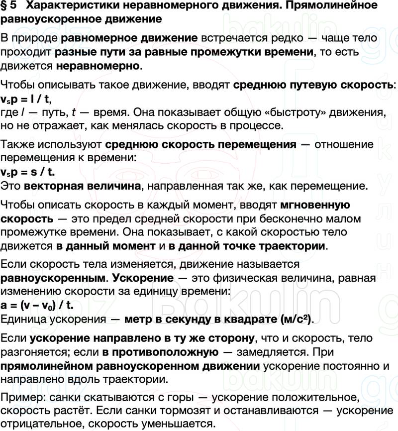 Краткое содержание Параграф 5 Характеристики неравномерного движения. Прямолинейное равноускоренное движение Физика 9 класс Перышкин