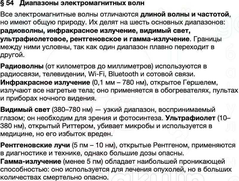 Краткое содержание Параграф 54 Диапазоны электромагнитных волн Физика 9 класс Перышкин
