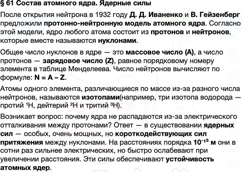Краткое содержание Параграф 61 Состав атомного ядра. Ядерные силы Физика 9 класс Перышкин