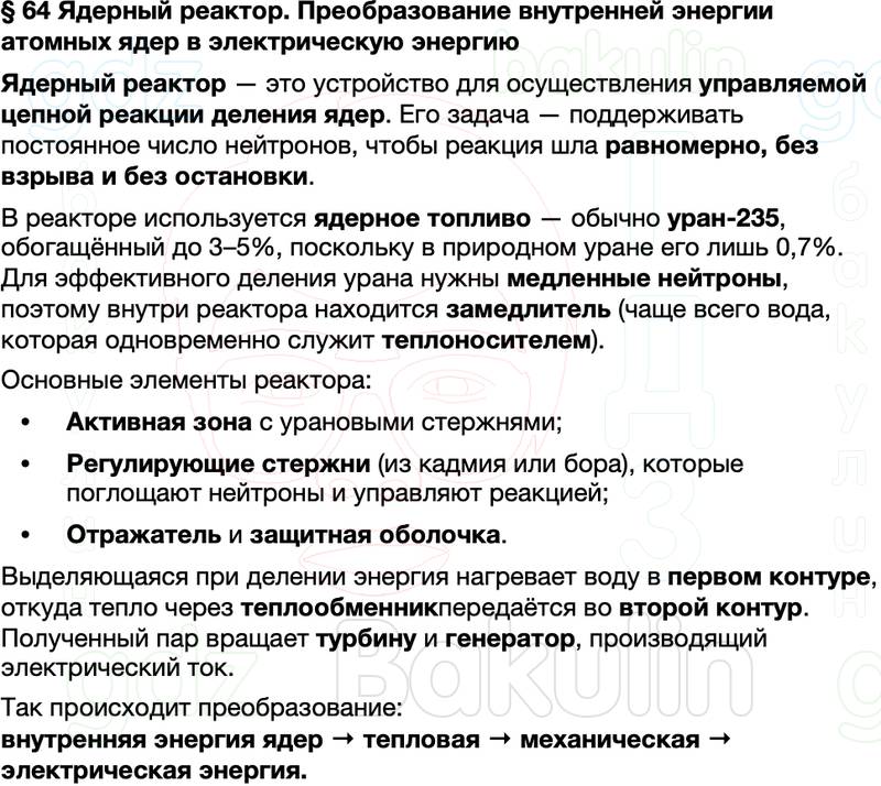 Краткое содержание Параграф 64 Ядерный реактор. Преобразование внутренней энергии атомных ядер в электрическую энергию Физика 9 класс Перышкин