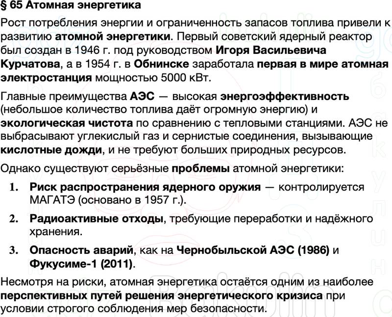 Краткое содержание Параграф 65 Атомная энергетика Физика 9 класс Перышкин