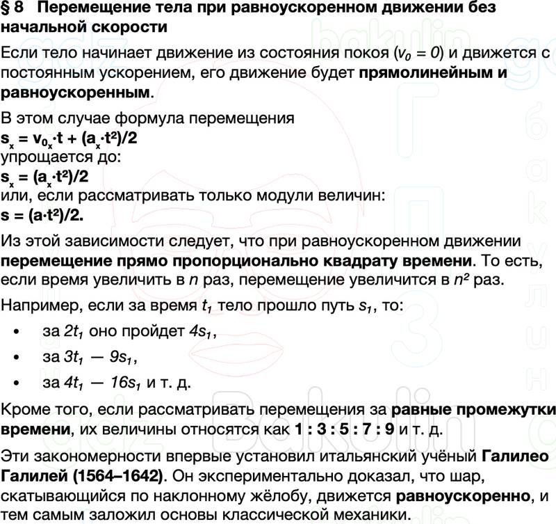 Краткое содержание Параграф 8 Перемещение тела при равноускоренном движении без начальной скорости Физика 9 класс Перышкин