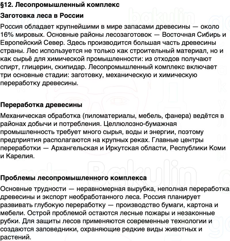 Краткое содержание Параграф 12 Лесопромышленный комплекс География 9 класс Алексеев