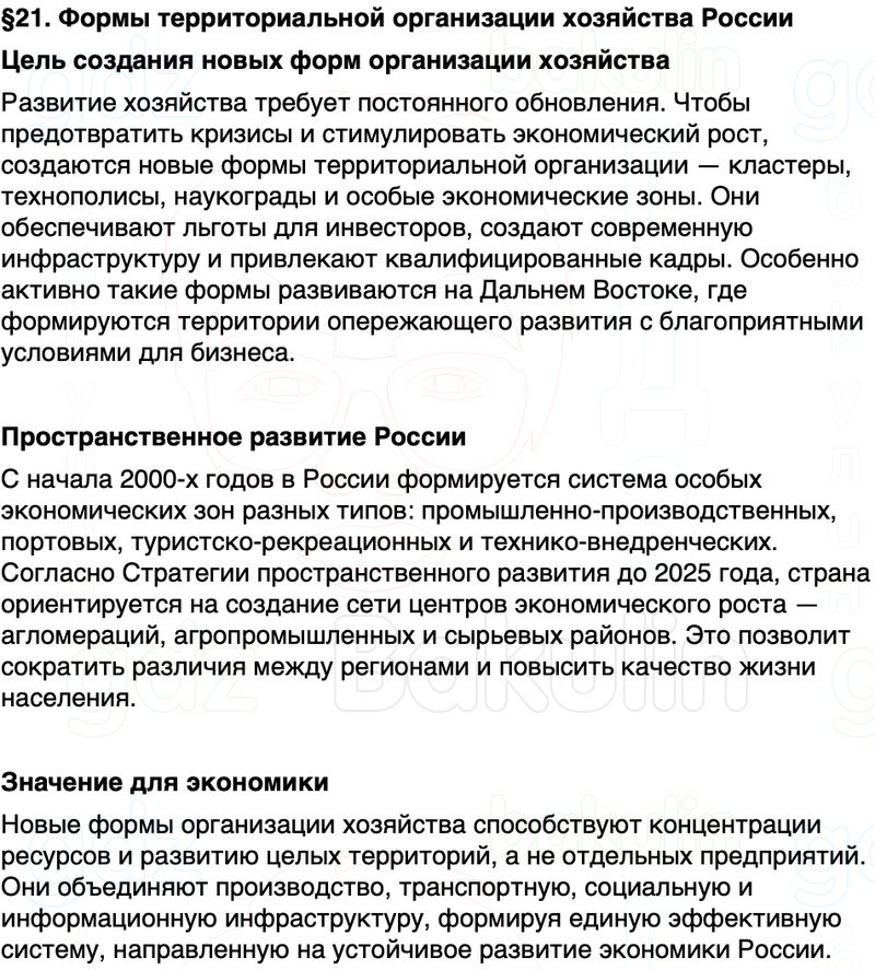 Краткое содержание Параграф 21 Формы территориальной организации хозяйства России География 9 класс Алексеев