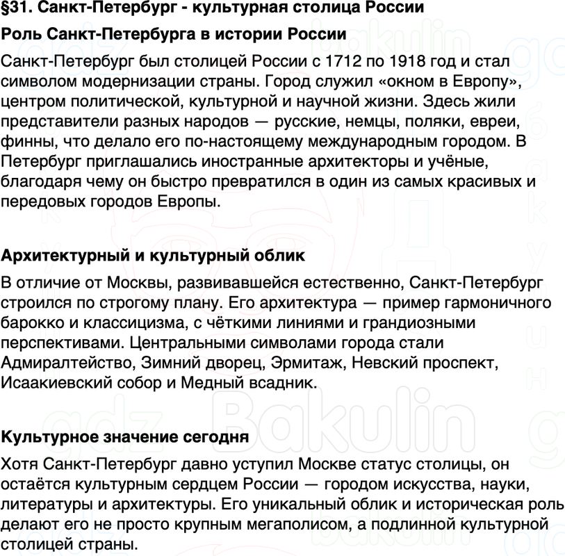 Краткое содержание Параграф 31 Санкт-Петербург - культурная столица России География 9 класс Алексеев