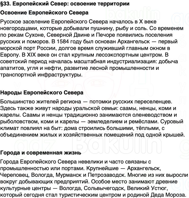 Краткое содержание Параграф 33 Европейский Север: освоение территории География 9 класс Алексеев