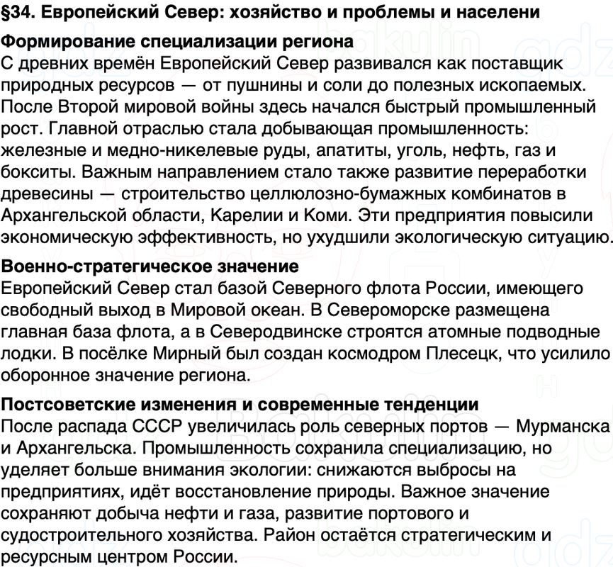 Краткое содержание Параграф 34 Европейский Север: хозяйство и проблемы и населени География 9 класс Алексеев